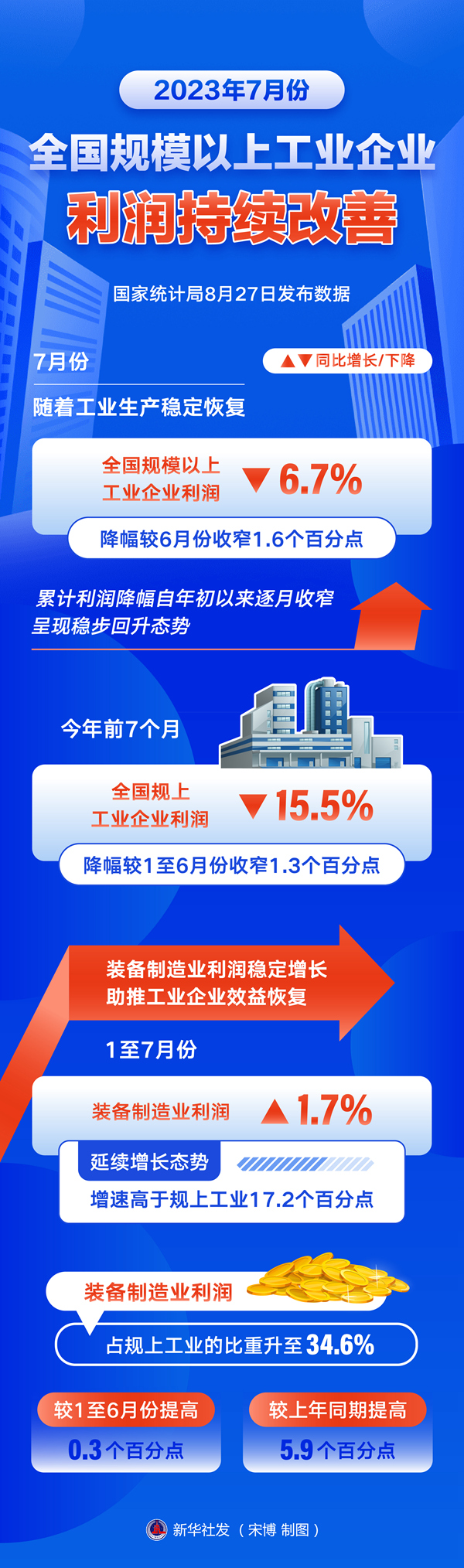 统计数据显示,今年前7个月,全国规上工业企业利润同比下降15.5%,降幅较1至6月份收窄1.3个百分点。