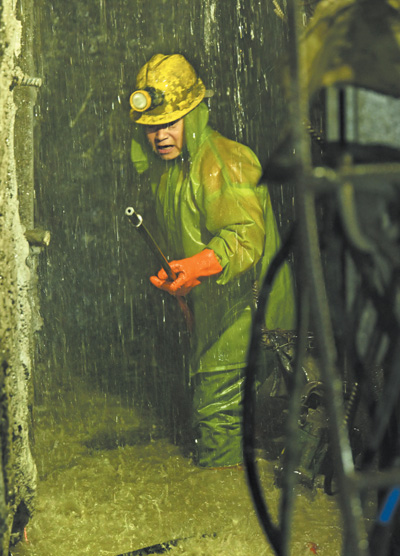 引汉济渭二期工程南干线黄午隧洞11号支洞控制段,工人冒着涌水掘进施工。