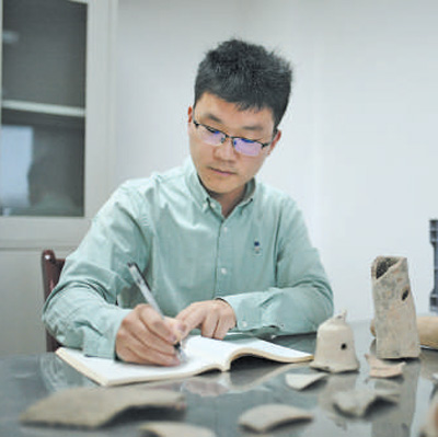 许丹阳在整理记录出土陶器。