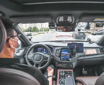 首批获得广州智能网联示范运营资质的滴滴自动驾驶网约车在广东省广州市花都区开启商业化示范运营,市民可在滴滴自动驾驶小程序下单呼叫车辆,体验自动驾驶服务,按实际行驶里程和使用时长付费。图为滴滴自动驾驶的安全员在监控车辆行程中全程不用触碰方向盘。