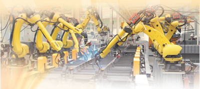 中集车辆旗下江门LTP生产中心里,机器人正在自动焊接。