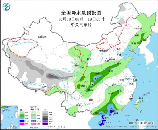 10月17日08时至18日08时,新疆西南部山区、西藏、青海东部和南部、甘肃西部、川西高原北部等地的部分地区有小到中雪或雨夹雪,其中青海南部等地局地大雪;甘肃南部、陕西、山西中北部、四川北部、广东中西部、海南岛等地的部分地区有中到大雨,其中,海南岛东部、广东中部偏南地区局地有暴雨(50~90毫米)。内蒙古中东部、广西东南部、海南岛等地的部分地区有4~6级风。