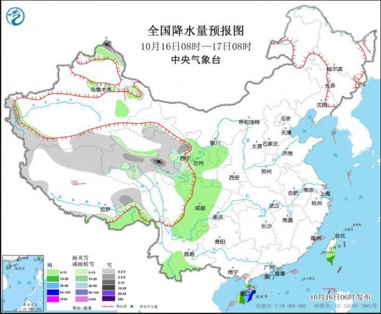 10月16日08时至17日08时,新疆北疆北部和南疆南部山区、西藏北部和东部、青海等地的部分地区有小到中雪或雨夹雪,其中,新疆北疆北部、青海中部等地局地有大雪;甘肃南部、宁夏、四川西南部和盆地西部、云南东北部和南部、海南岛、台湾岛等地的部分地区有小到中雨,其中海南岛东部有大雨,局地暴雨(50~90毫米)。黑龙江中东部、广西东南部、海南岛、西藏中部等地有4~6级风,其中西藏中部的部分地区风力可达7级以上。