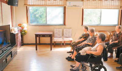 几位老人在河北省石家庄市正定县塔元庄村劲松老年公寓的活动室看电视。