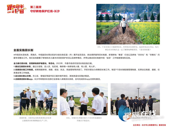 为了坚决防止耕地的“非农化”和“非粮化”,市级田长吴桂英、周海兵,市级副田长周志凯多次前往各区县(市)展开巡田活动,亲自调研督导田长制度、新增耕地“春苗”行动以及耕地“非农化”和“非粮化”问题专项整治工作。市政府还成立了田长制办公室,组织发布了长沙市田长制工作的动态和成效。同时,长沙市建立了健全的田长体系,配备了7797名各级田长,确保每一块耕地有人看管和保护。