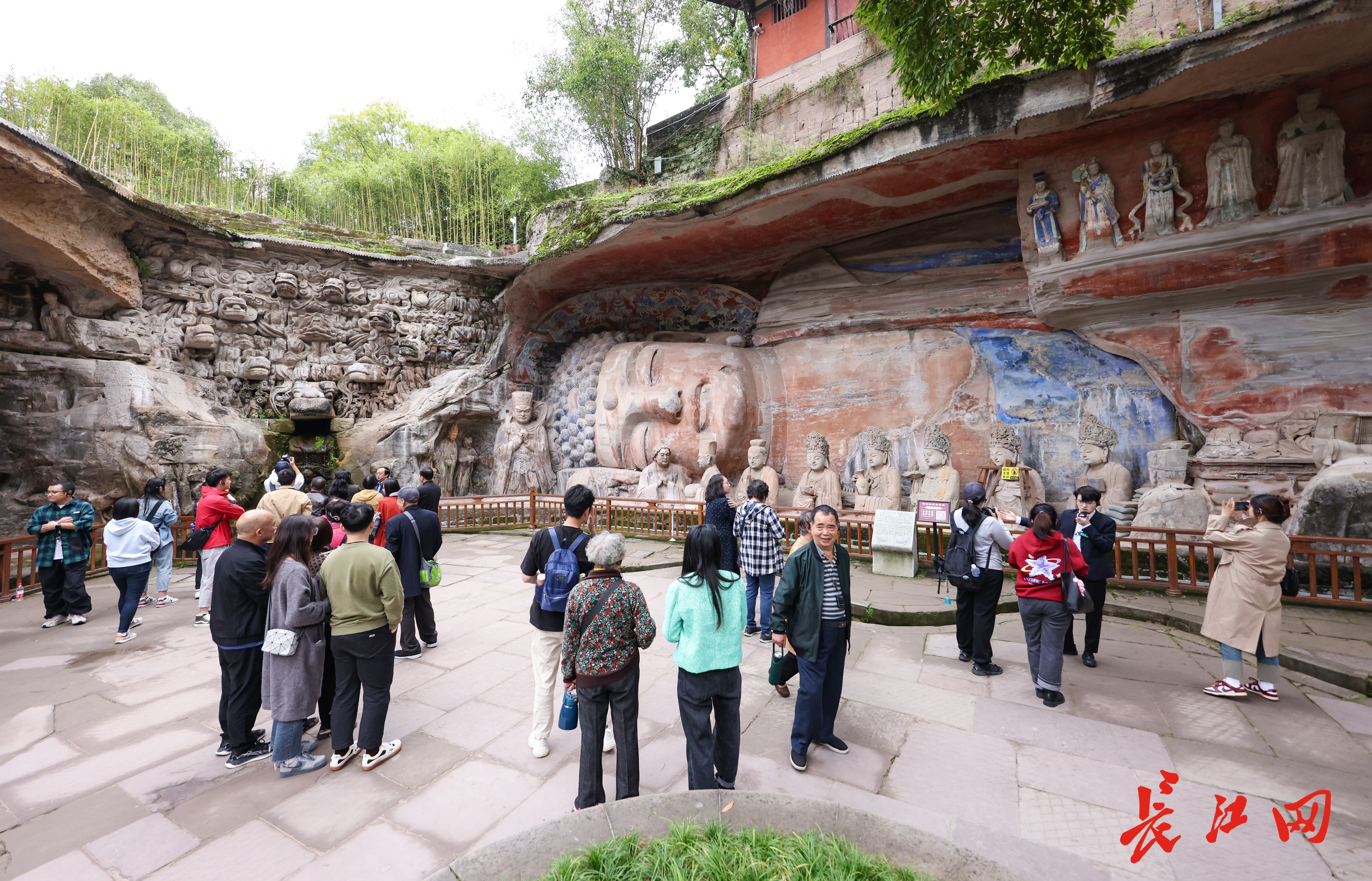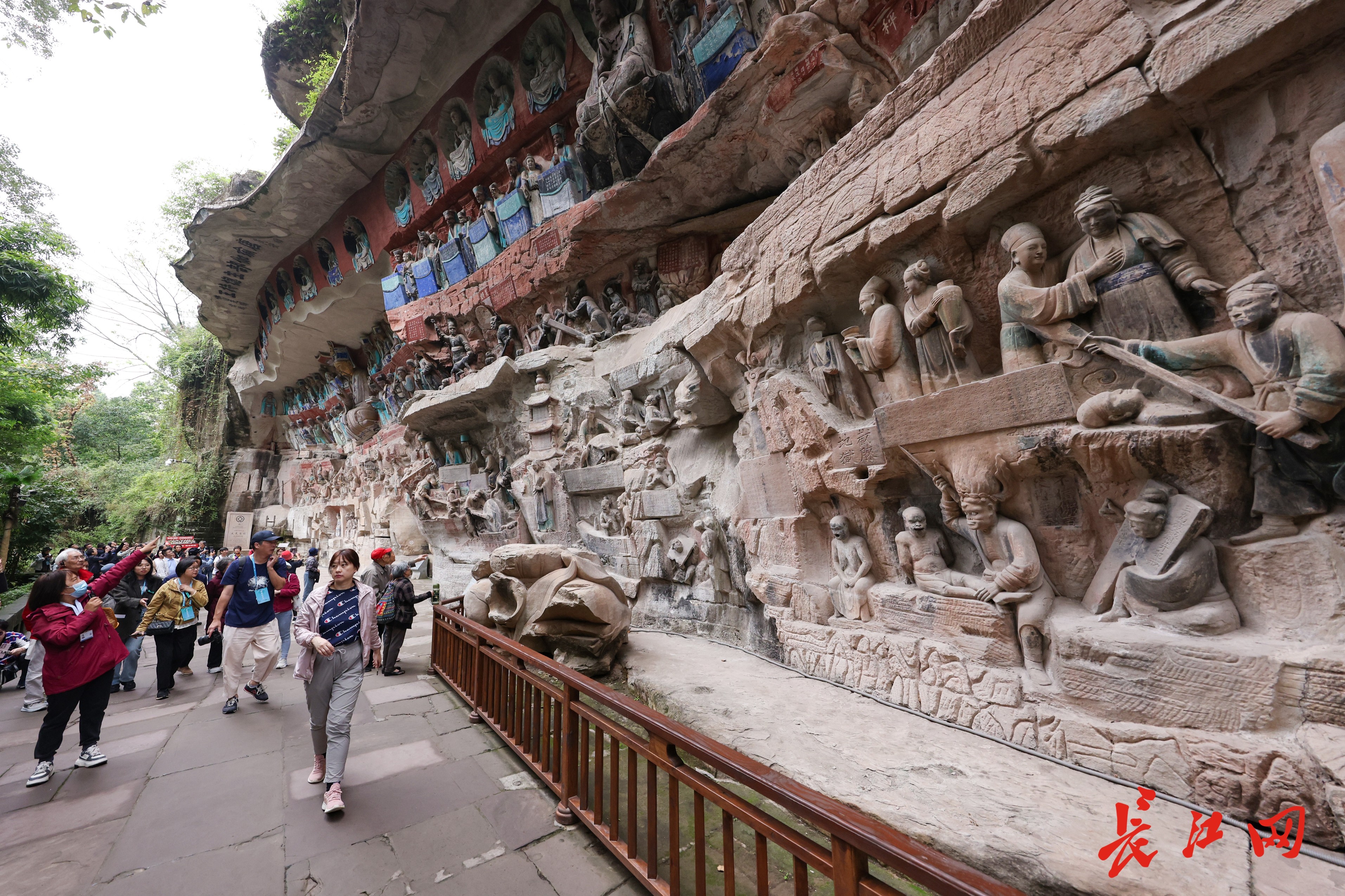 “‘北敦煌,南大足’。大足石刻是中国南方石刻的代表。”探访团成员、武汉大学长江文明考古研究院考古专家贺世伟说,中国的石窟造像艺术经历了从北到南发展的过程,它不仅仅是佛教精神的凝聚,更是各时代文化精神的展现,中国人的生活观念与审美意趣都会从中反映。当安史之乱后北方云门、龙冈等石窟走向衰落之时,唐玄宗、唐僖宗先后避乱于蜀,很多文人雅士、能工巧匠随之南迁,中原文化和巴蜀文化结合,在秦岭以南的川渝地区,大足石窟艺术得以延续和发展,并加快了佛教中国化进程,进一步趋向于世俗化,内涵也不断得到扩展,佛道儒思想得以进一步融合,这极大地推动了中国传统文化的创新与发展,所以大足石刻也被人称作中国石窟艺术史上最后的丰碑。