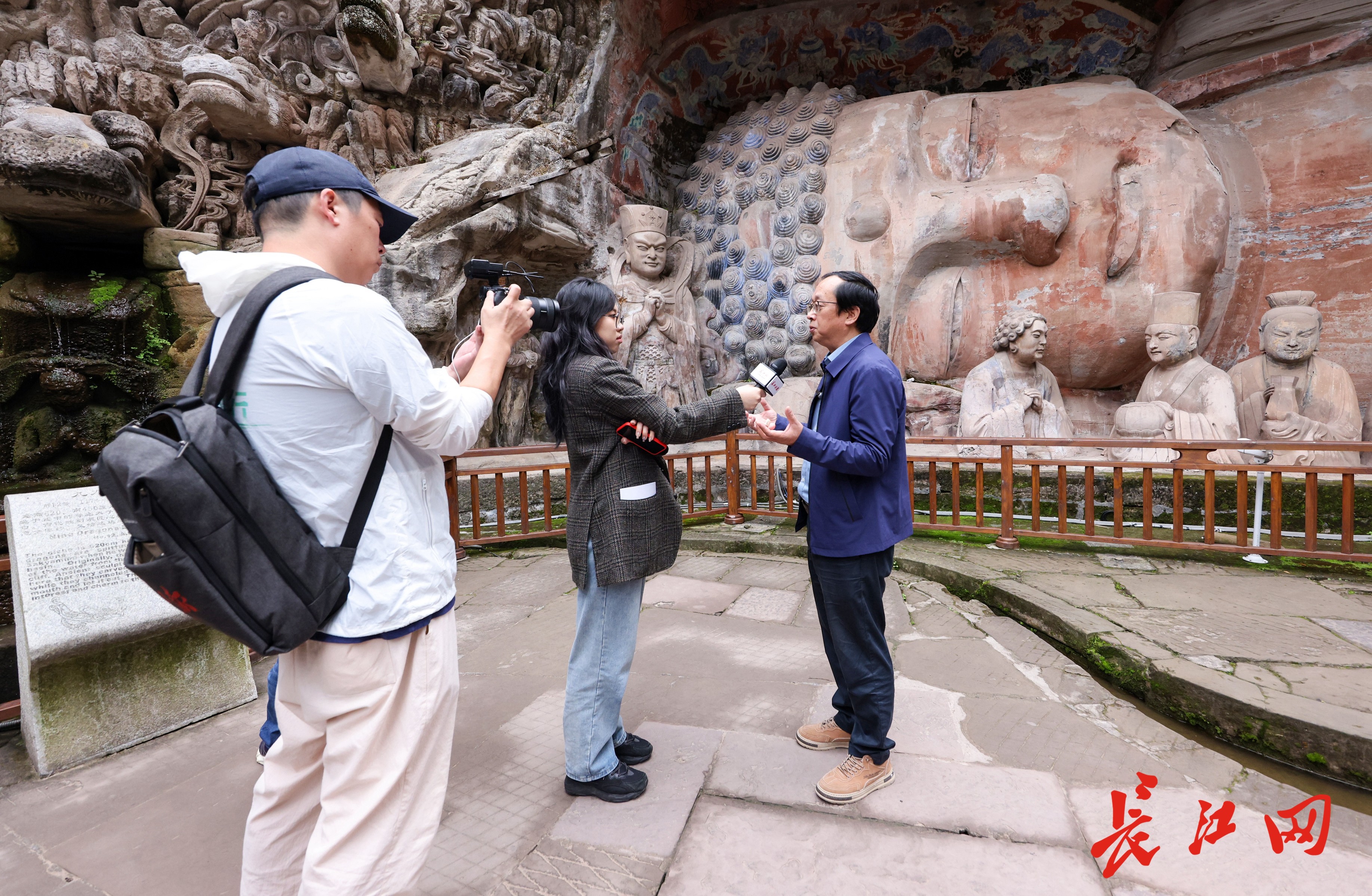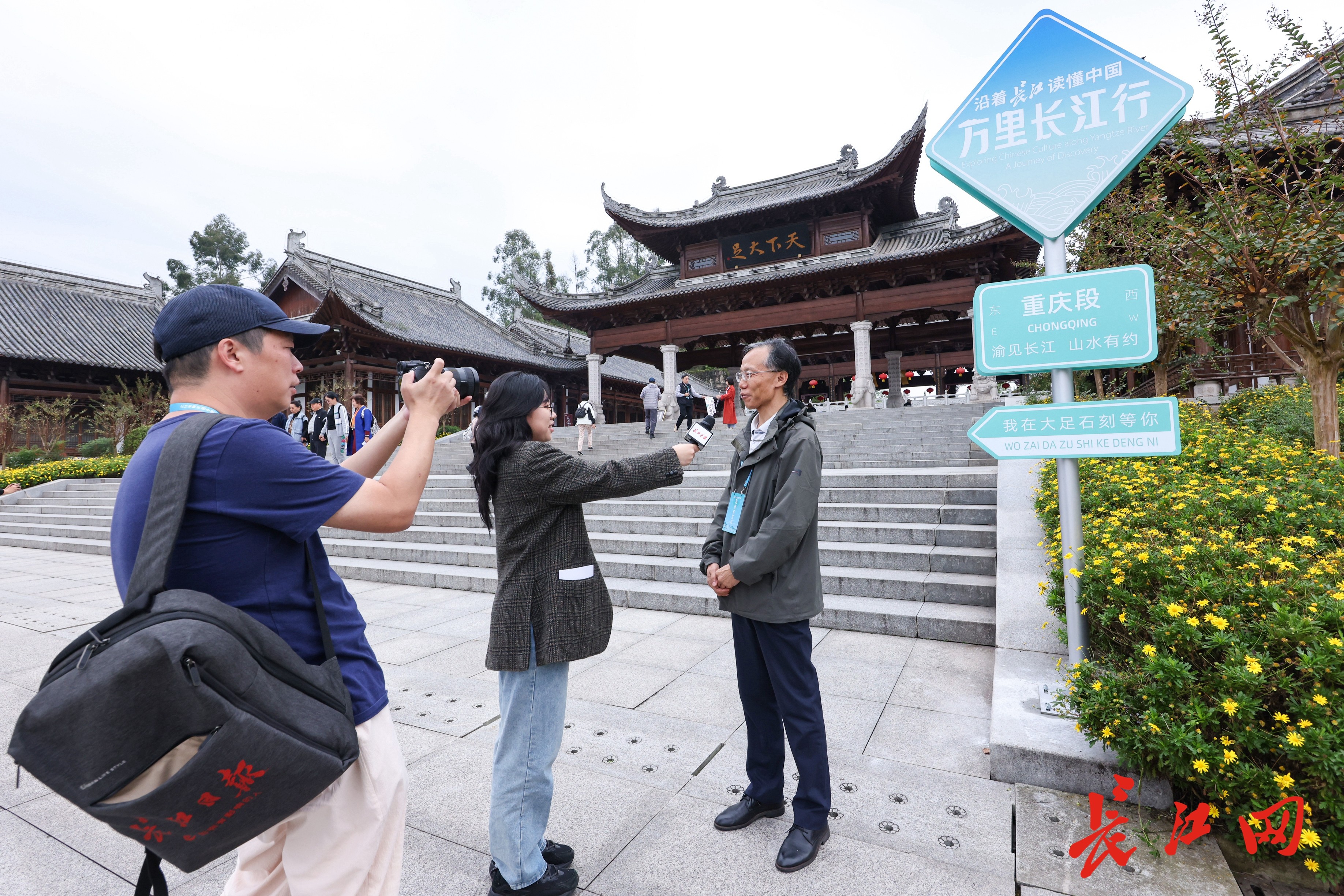 探访团成员、武汉大学长江文明考古研究院考古专家贺世伟接受长江日报-长江网记者采访,其身旁是探访团在大足石刻博物馆前设置的打卡装置。王筝 摄
