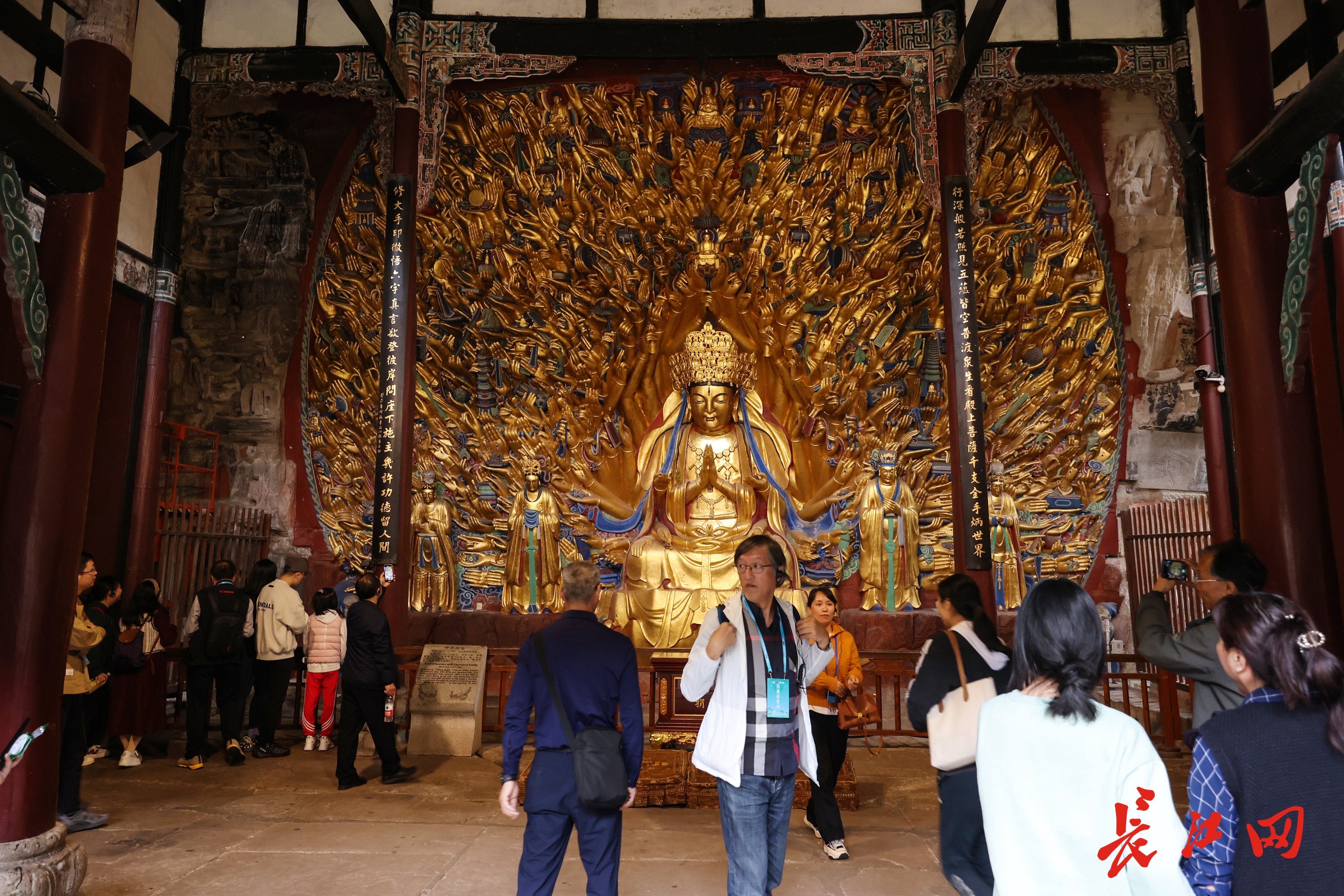 在宝顶山大佛湾南崖88平方米的石岩上,一龛金碧辉煌的千手观音,让游客纷纷惊叹“震撼”。