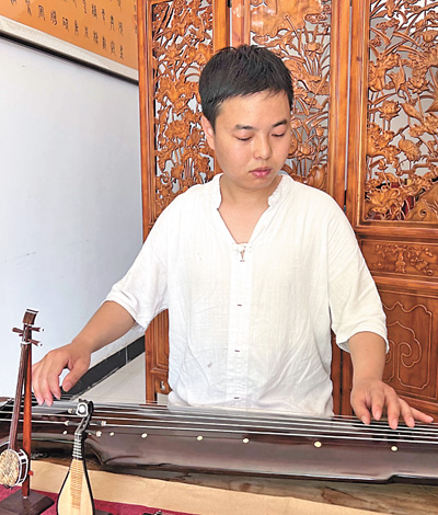 黄昏时分,步入范场村,路途平坦,窗明几净,村庄道路旁悬挂着各式乐器元素的装饰品。寻声徐步,走入一间小院,悠扬的古琴声在空中回荡,余音松沉旷远,仿佛清风拂面。