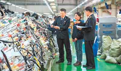 安徽省淮北市海关部门通过构建“加工贸易手册辅助监管系统”、强化保税料件核查等举措,提高加工贸易保税业务的规范化操作和标准化管理水平。图为淮北海关关员在当地一家企业开展保税料件核查。