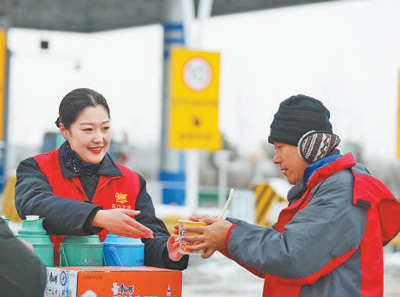 2月2日,安徽交控集团蚌埠管理处工作人员为滞留司乘人员提供热水简餐等服务。