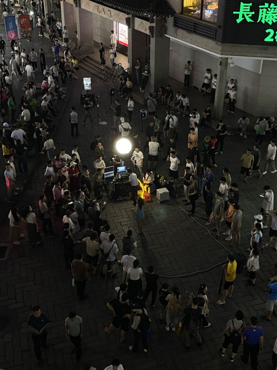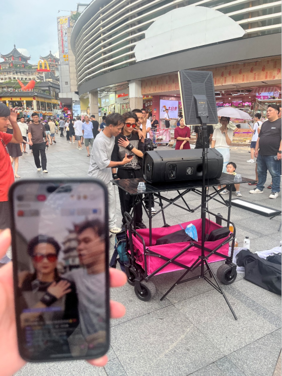 从老街地铁站出至地面,即是东门步行街的入口之一——解放西广场,这里是东门人流量最大的道路之一,也是“网红直播一条街”的起点。从广场继续向前走,每隔三五米便有一个直播单位正在准备,他们有的是团队作战,用灯光、支架等设备围拢出一个专属范围,定点直播;还有的主播选择独立作战,用一台架在支架上的手机,外加补光灯、麦克风等设备就开播了;还有的,就是像爆爆一样,选择“走播”的形式,边走边播,与路人一同穿行在东门的街道上。在街边商铺的音乐声与人流穿梭中,主播们站到灯光与镜头前,开始了一天的直播大秀。