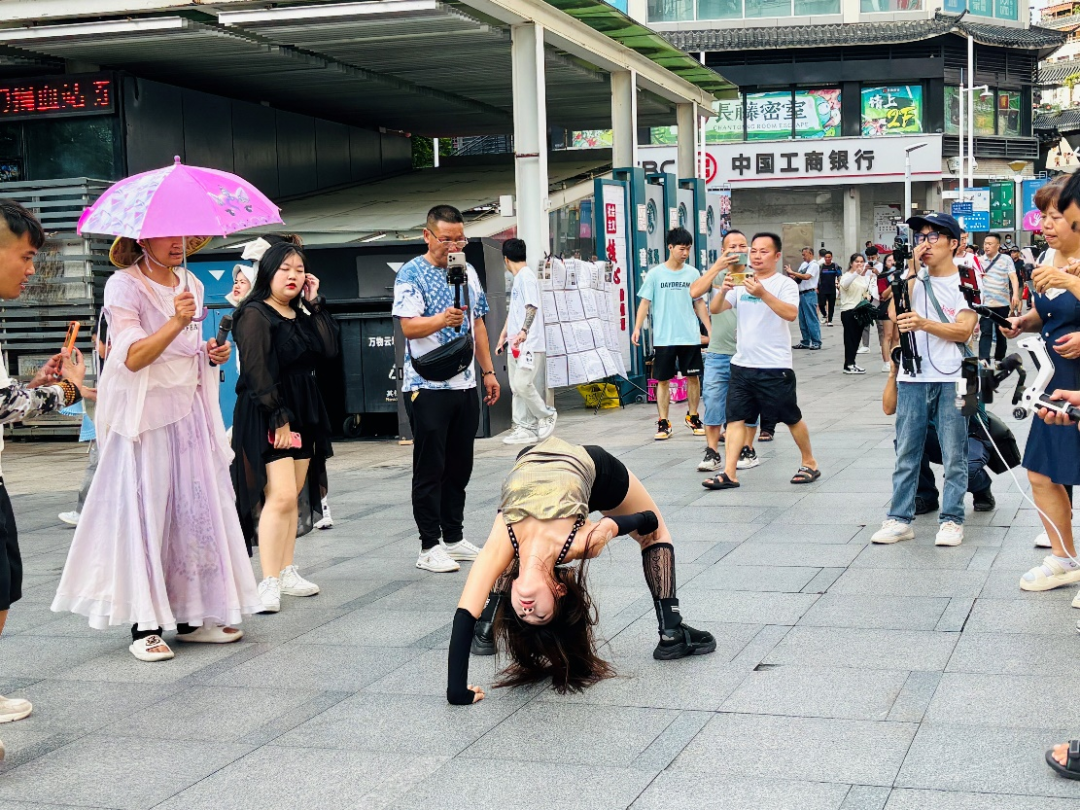 2023年10月之后,众多主播向东门聚拢,逐梦淘金,为东门带来更加庞大的流量,抖音主播“小章先生”就在这时来到东门。因为热爱跳舞,小章从云南老家走出来,参加过多个舞蹈比赛,当过舞蹈老师,最后因为追求纯粹的热爱,和几个好友一起来到东门开展街舞直播。他坦言,做街舞直播很辛苦,Breaking舞种里有很多危险动作,甚至需要肉身抵着地板一直转。有时直播结束,身上的白衣服都会变成红衣服,因为背上流着血,到现在背上还都是疤痕。同时,他也认为东门的直播环境和氛围很好,社区对他们开展直播很支持,所以他和团队目前还是会继续在东门做直播。