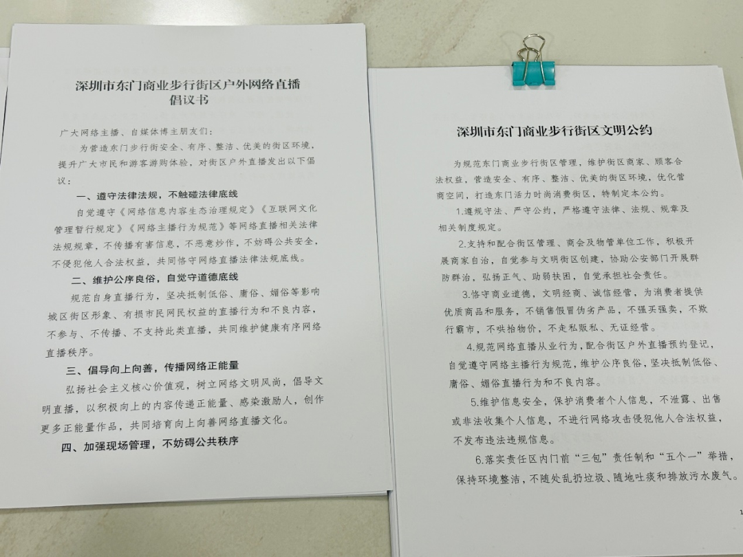 今年1月,在罗湖区东门街道组织的一次网络主播座谈会上,相关部门负责人便表示,对于户外直播不能简单地“一刀切”,既要规范化管理,还要大力支持正能量直播在罗湖开花。《深圳市东门商业步行街区户外网络直播指引》《深圳市东门商业步行街区文明公约》等文件的下发,为东门直播划出了“红线”: