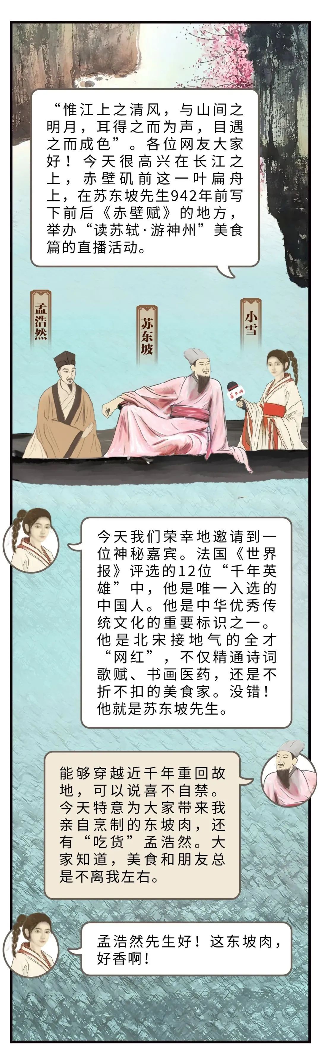 “读苏轼·游神州”中华文化主题旅游线路宣传推广活动正在如火如荼举行,全国31个省市自治区和20个东坡遗址遗迹城市加入,串珠成链展现东坡魅力。作为全国重点新闻网站,长江网特意策划了一场直播活动,邀请苏东坡和孟浩然重游赤壁,与主播小雪泛舟长江,畅谈古今,共襄这场文旅盛事。