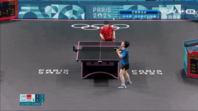 巴黎奥运会乒乓球女子单打32强赛中国选手孙颖莎VS卢森堡选手倪夏莲。动图来源:CCTV5+