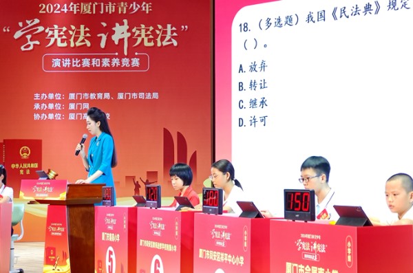 2024年厦门市青少年“学宪法 讲宪法”演讲比赛和素养竞赛现场决赛由厦门市教育局、厦门市司法局主办,厦门网承办,厦门城市职业学院、厦门高新学校协办。主办方表示,接下来将继续加强青少年法治教育工作,为培养更多知法、懂法、守法的新时代青少年而不懈努力。