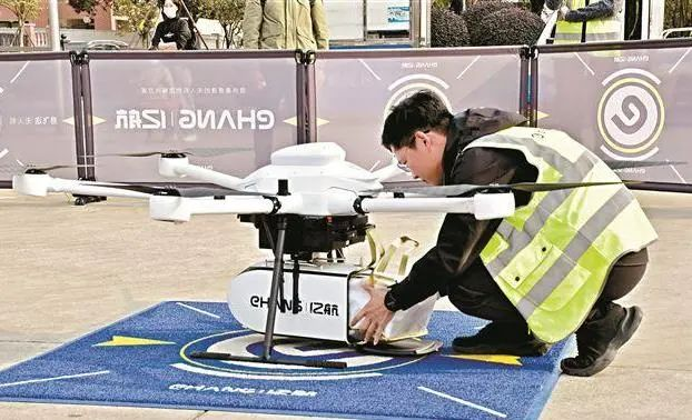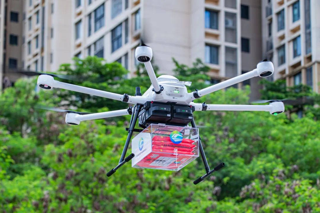 在广州太古仓码头,一架无人机渡江而来,短短几分钟后便顺利降落,取出时可以看到密封盒内的生鲜品质上佳。此次运输起降点距离4.8公里,如果由骑手运送,因为要跨江,需要50分钟左右,而无人机运输只需要8分钟不到。