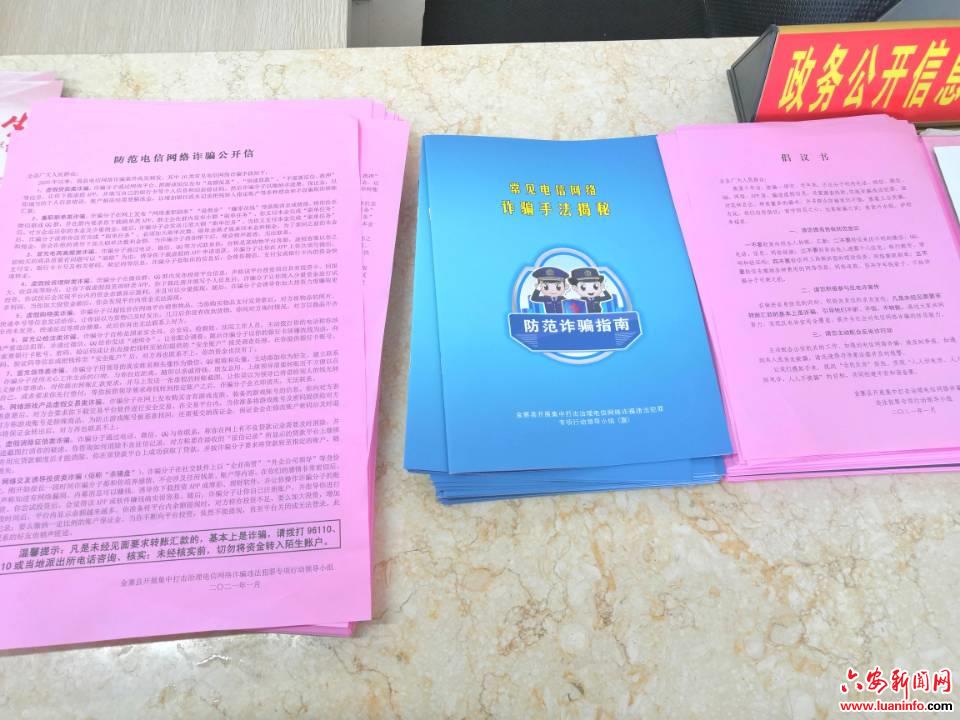 线下,落实反电诈宣传“十个一”要求,在全乡范围内组建了一支宣传队,开展了一场培训会,张贴了一张海报、一批标语,发放了一封公开信、一份倡议书、一本宣传册,播放了一篇广播、一部宣传片、一组微视频,全面筑牢“反诈骗”屏障 。