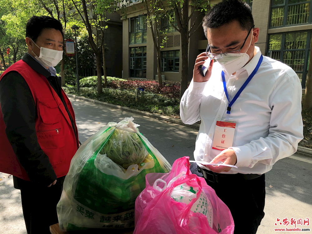 “您好,您从网上下单购买的蔬菜到了,请下到一楼领取!”4月6日上午10点许,值守在裕安区凯旋观邸小区志愿服务点、市农业农村局社会事业促进科工作人员叶乃宝(图右一),正满头大汗地联系被封楼栋业主领取蔬菜和生活用品。