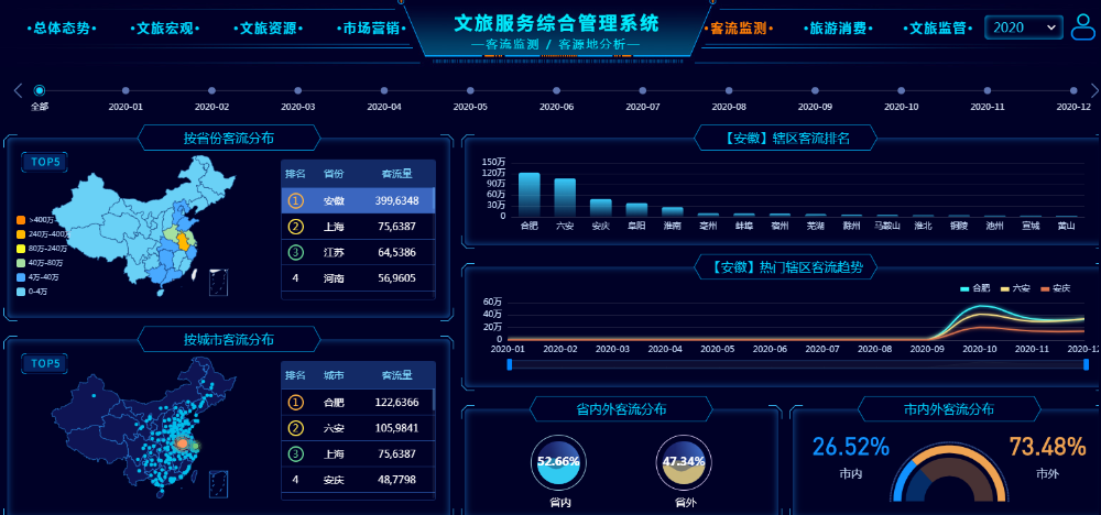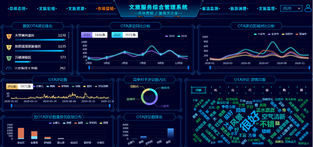 六安文旅服务综合管理系统按照以文旅资源支撑市场营销、以市场营销促进客流增长、以客流增长带动文旅消费、以文旅监管提升服务水平的工作思路,精准识别客源市场,针对不同市场实施不同的营销手段,实现营销效果最大化;基于丰富的OTA数据,从景区、酒店、美食三个维度掌握舆情趋势,针对性的开展监管活动。利用专业的大数据分析和数据解读,结合实际工作,定期发布文旅产业大数据分析报告,提高文旅部门智慧化服务和管理水平,为领导决策、经济运行、行业监管等提供较好的支撑。