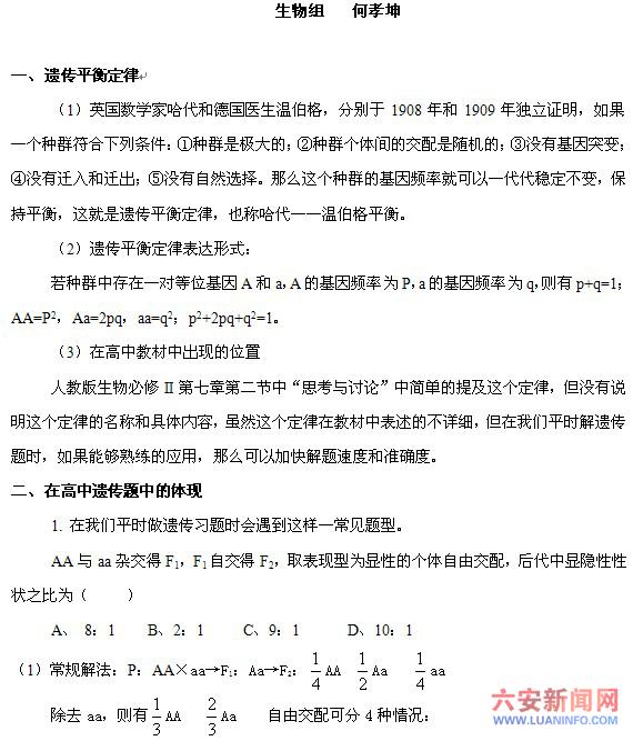 从上述四题中,我们不难发现,遗传平衡定律在解遗传学习题时给我们带来了便捷,如果我们能熟练掌握,在解自由交配这类习题时,我们可以准确、快捷地获得答案。