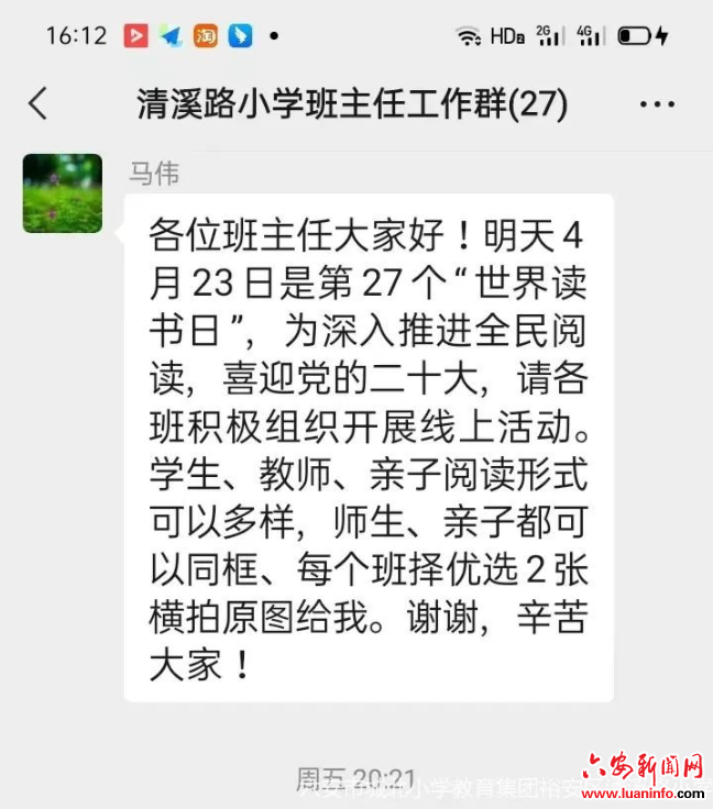 书籍是孩子眼中的七彩殿堂,阅读是儿童心中的快乐源泉。联合国教科文组织早在1995年11月15日确定每年的4月23日为世界读书日,时光悠悠,岁月漫漫,它陪伴我们沉淀知识,敛藏文韵已达27年。为了促进师生读书习惯的养成和阅读能力的提升,打造和丰富浓郁的校园文化底蕴,践行“书香中国,全面小康”的读书日主题,裕安区清溪路小学以世界读书日为契机,因时制宜,因地制宜,创造性地开展读书日活动。