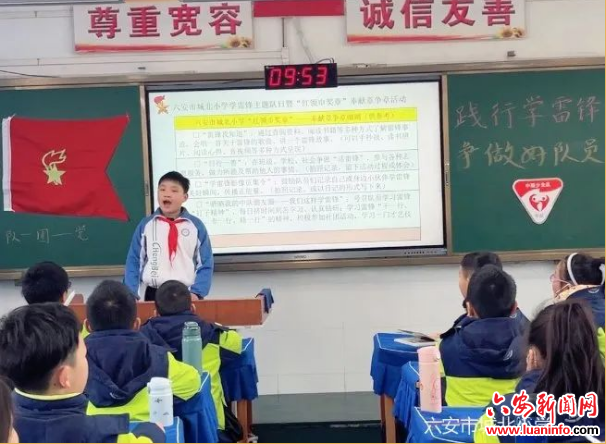 随后,各中队纷纷开展了“学雷锋”暨“红领巾奖章”奉献章争章主题队会。辅导员老师们通过队会、队课等形式带领队员们学习《六安市城北小学“红领巾奖章”实施方案》和“奉献章”争章细则,引导学生积极参与争章活动,将学雷锋活动融入日常、化作经常,让雷锋精神在新时代绽放更加璀璨的光芒。