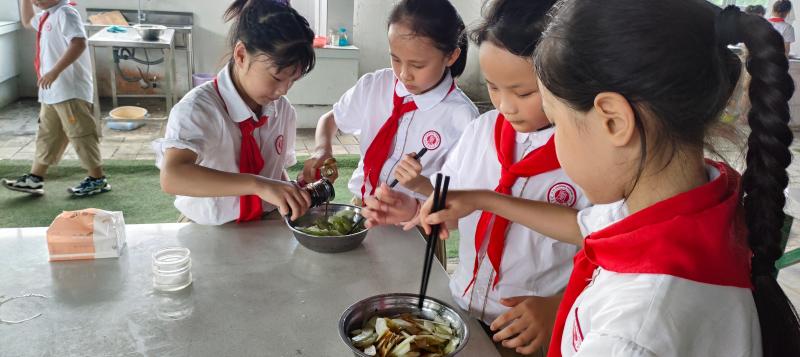 鸿鹄中队的少先队员们整装待发,一路伴随着欢声笑语来到了神农劳动实验基地。师生共同走进了种满瓜果蔬菜的田地上。灿烂的阳光下队员们不惧炎热,在田园中四散开来,采摘了许多的菜瓜、辣椒、空心菜、葫芦、小香瓜等。在实践活动老师的指导下,队员们认真学习如何使用锄头锄去田地里的杂草。一饭一菜皆来之不易。队员们用刚摘下来的新鲜蔬菜,在大锅台前亲自动手翻炒、添加佐料,做出了美味的炒茄子和凉拌菜瓜,为午餐增添了丰富的菜品。午餐过后,精力充沛的队员们,纷纷踊跃报名参加才艺表演,有的唱歌,有的跳舞,有的诗朗诵……在小小的舞台上展现了非凡的魅力。下午,同学们体验学习了制作凉粉。爽口的凉粉是夏天家家户户的餐桌必备,队员们先围在一起听实践活动老师介绍凉粉的材料和做法,然后动手实践并观察凉粉的制作过程,最后每位队员都品尝到了包含自己劳动成果的热凉粉。