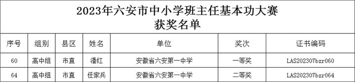 为深入学习贯彻党的二十大精神,落实立德树人根本任务,进一步探索新时代班主任队伍建设的新机制、新途径、新方法。7月13日和14日,市教体局在皋城小学举办了2023年市中小学班主任基本功大赛,六安一中潘红老师获得市一等奖、任家兵老师获得市二等奖的佳绩。