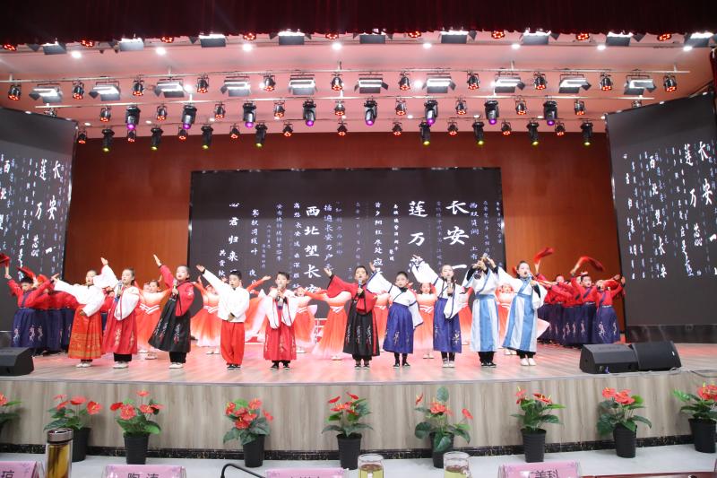 整台经典诵读节目展演分为三个篇章:《礼赞经典诗歌》《礼赞民族脊梁》《礼赞伟大祖国》。孩子们在舞台上或激情澎湃、或声情并茂、或深情诉说,从婉约清丽的《诗韵四季》到振聋发聩的《满江红》;从意气勃发的《中国正青春》到豪情壮志的《我喜欢红色》;从满怀希望的《礼赞新生活》到深情歌颂的《长安三万里》……伴随着一篇篇经典作品的诵读,表达了对唐诗宋词的感受,对先贤的追忆、对青春的赞美、对祖国的无比热爱,孩子们以铿锵有力的气势、充沛饱满的感情、自信大方的形象赢得了领导、老师、家长和同学们的阵阵掌声。