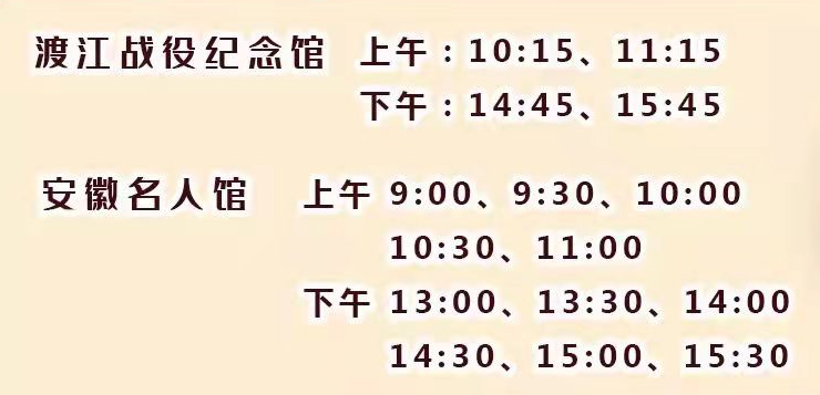 所有观众(包括儿童、老年人)必须通过渡江战役纪念馆、安徽名人馆的微信公众号或游安徽小程序实名制预约,渡江战役纪念馆每日限额5200人,安徽名人馆每日限额7500人。