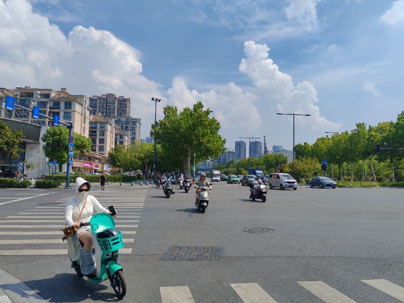 8月29日,市民骑行在火热的合肥市街头。