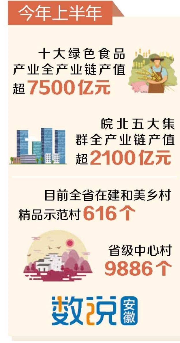 乡村振兴,产业振兴是关键。“十四五”以来,我省坚持推动乡村富民产业升级,提高农业综合效益,乡村产业蓬勃发展。强化“双招双引”,大力推进十大千亿级绿色食品产业全产业链建设,打造皖北高端绿色食品产业集群。今年上半年,十大绿色食品产业全产业链产值超7500亿元,皖北五大集群全产业链产值超2100亿元。
