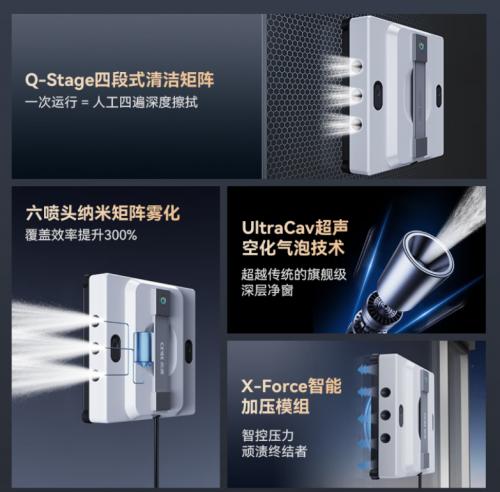 这款设备配备了六喷头纳米级雾化装置,喷雾覆盖效率提升 300%,喷雾更均匀,实现了360度无死角均匀清洁,顽渍速溶、边角无残留,告别水痕,带来旗舰级全景净窗体验。配合独家研发的UltraCav 超声空化技术——气泡瞬间爆裂释放冲击力,顽渍分子直接瓦解,深层清洁更彻底。