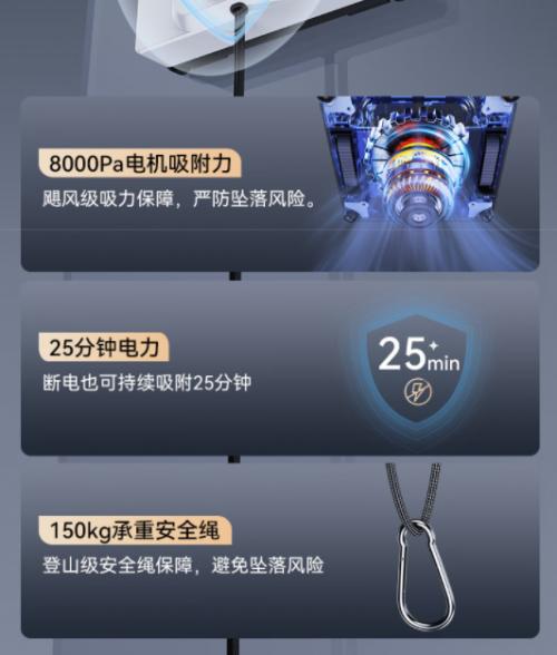 设备还配备了WSafe 断电保护系统,内置600mAh电池,断电自动供电约25min,配合150Kg登山级安全绳,全程稳固防坠,杜绝安全隐患。同时,搭载高算力AI智能芯片,实时快速响应,走得更准、覆盖更全,不留死角。清洁完成后还能自动返回原点,方便取下,真正实现高效彻底又贴心的旗舰级擦窗体验。