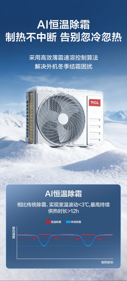 对于冬季寒冷的北方,TCL小蓝翼P7 Ultra AI健康空调柜机AI恒温除霜功能可实现制热不中断,告别忽冷忽热。采用高效薄霜速溶控制算法,解决外机冬季结霜困扰,相比传统除霜,实现室温波动<3℃,最高持续供热时长>12h。
