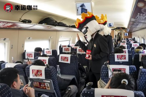 为增进品牌与消费者的联结,幸运咖品牌 IP“老K”现身多个车厢,与车厢里的乘客进行热情互动,派发新年礼物,为在途乘客送上新年祝福。