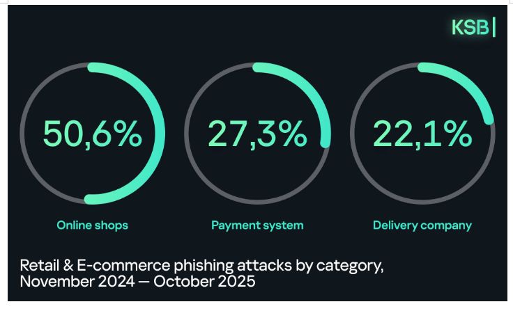 售领域的网络钓鱼活动格外引人注目。尽管这项攻击技术由来已久,但在在线购物场景中,网络钓鱼仍保持着极高的活跃度。2024年11月到2025年10月,卡巴斯基的产品阻止了6,651,955次针对在线商店、支付系统和快递服务用户的网络钓鱼链接访问尝试。其中,50.58%的尝试针对在线购物者,27.3%冒充支付系统,22.12%针对快递公司的用户。