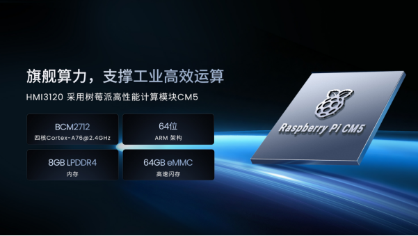HMI3120 采用树莓派高性能计算模块CM5 ——BroadcomBCM2712 四核 Arm Cortex-A76,主频达2.4GHz。依托 64 位 ARM架构的强劲性能,可以轻松应对多任务并发、复杂数据可视化渲染及实时控制指令响应。存储方面标配 8GB DDR4 高速内存,内置64GBeMMC高速闪存。