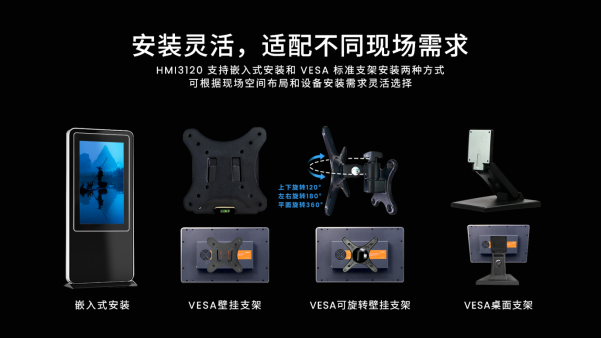HMI3120 支持嵌入式安装和 VESA 标准支架安装两种方式,可根据现场空间布局和设备安装需求灵活选择。我们有专为其设计的用于VESA标准支架安装的配套配件,能匹配壁挂、桌面摆放等场景的安装需求,方便用户直接选用。