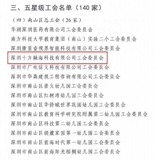近日,深圳市总工会正式公布全市首批三星级及以上星级工会名单。经严格审核与评定,深圳市十方融海科技有限公司工会委员会入选深圳市首批“五星级工会”。作为全市获评140家“五星级工会”之一的企业,这一结果,不仅是对十方融海工会既往工作的充分肯定,也是对公司整体职工服务以及和谐企业建设成果的高度认可。