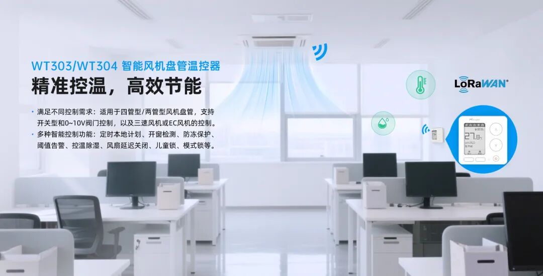 在炎炎夏日场景中,实现室内温度的智能调节与精准控温,对人体健康保障、建筑节能环保及延长制冷设备寿命具有重要意义。智能风机盘管温控器作为精准控制室温、提升体感舒适度的重要设备,依托高精度传感器,实时精准监测室内环境温湿度变化并快速响应,精准调节冷/ 热量输出量,保障环境舒适度的同时提升能源效率,降低碳排放强度,助力实现 “双碳” 目标。