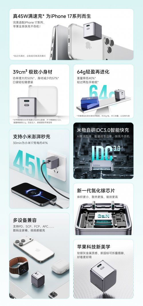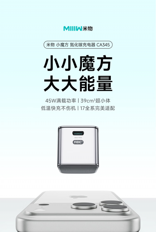 iPhone 17绝佳搭档亮相!米物推出小魔方45W氮化镓充电器,小体积满功率重塑快充体验