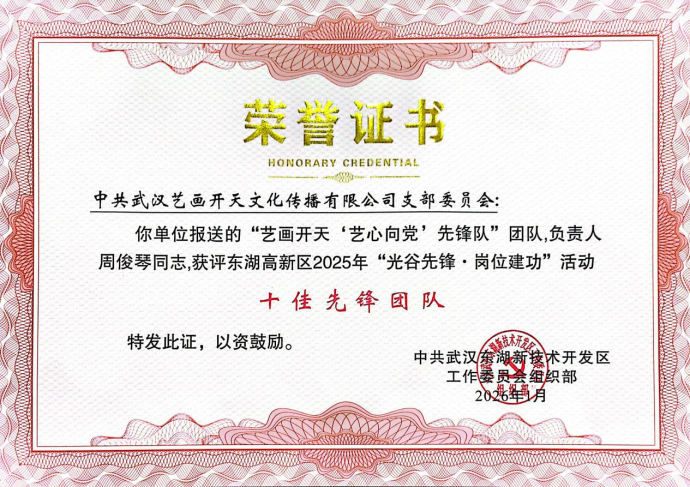 1月15日下午,经上级单位推荐、区级初筛,艺画开天“艺心向党”先锋队从281家单位中脱颖而出,经路演评比,荣获评分第二的好成绩,被武汉东湖新技术开发区工作委员会组织部授予东湖高新区2025年“光谷先锋•岗位建功”活动十佳先锋团队。