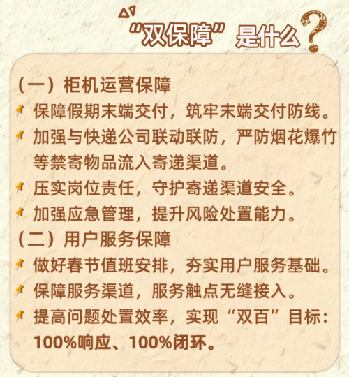 随着春节临近,快递业务迎来新一轮高峰。为应对节日期间的寄递压力与安全挑战,丰巢近日正式启动“2026双保障机制”,旨在通过强化柜机运营与用户服务两大体系,筑牢末端交付防线,确保寄递渠道安全畅通。