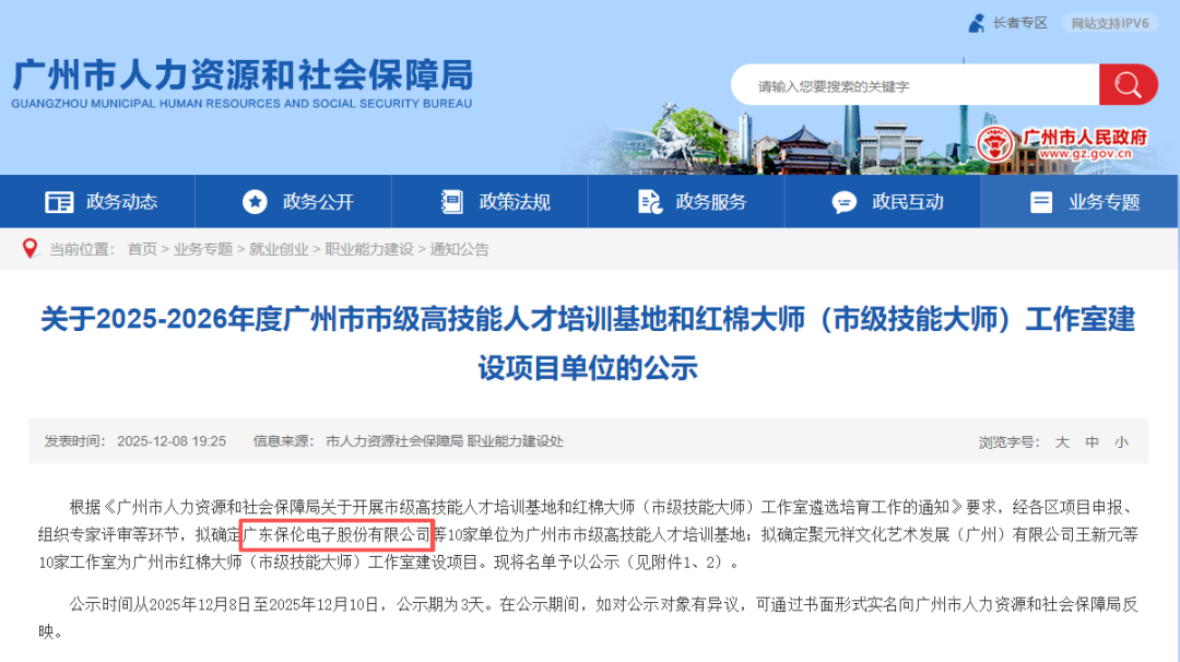 近日,广州市人力资源和社会保障局正式发布了《关于2025-2026年度广州市市级高技能人才培训基地和红棉大师(市级技能大师)工作室建设项目单位的公示》。在激烈的竞争中,itc保伦股份凭借在音视频领域深厚的技术积累与丰富的产业实践,成功入选 “广州市市级高技能人才培训基地”,标志着itc在产教融合与技能人才培训领域迈入规范化、示范化发展的新阶段。