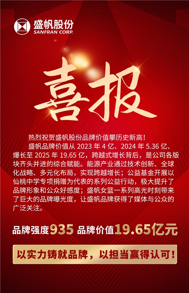 未来,盛帆股份将继续秉持“善待环境,让能源和资源更有价值”的使命,以技术创新驱动发展,以社会责任赋能品牌,持续提升品牌核心竞争力,书写品牌建设与企业发展的新篇章!(通讯员 王清)