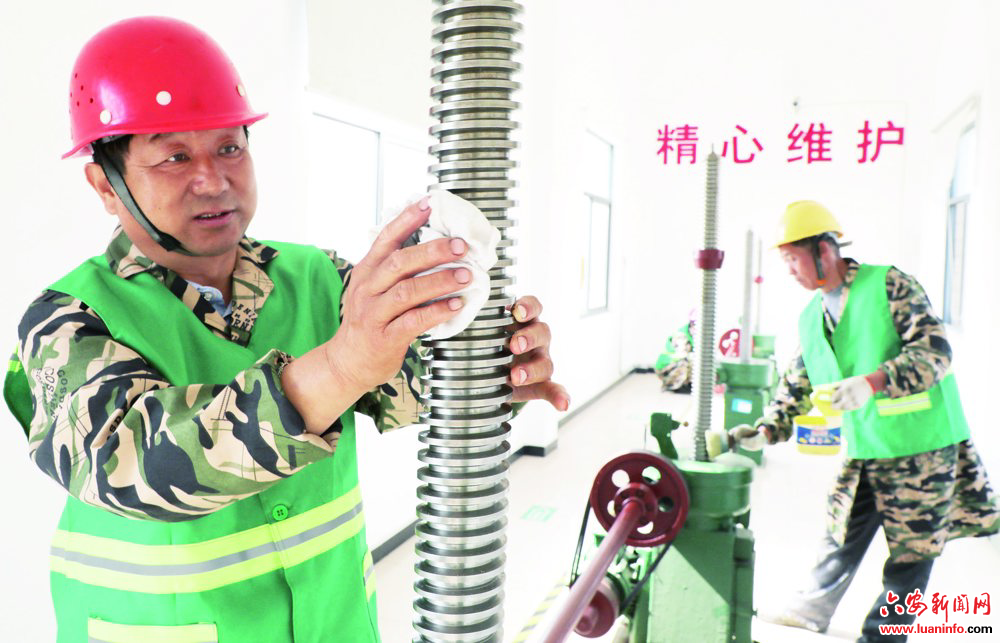 汛期即将来临,日前,市河湖处组织汛前安全生产检查组,对直管工程进行了汛前检查和安全生产检查,扎实做好工程运行管理各项准备工作。同时,加大沿河排涝涵闸的巡查力度,加强对泵站设施的维护保养,确保城区居民防洪排涝安全。图为4月20日,苏大堰排涝站设备维保人员正在对前池启闭机进行养护。(皖西日报融媒体记者 王丽 摄)