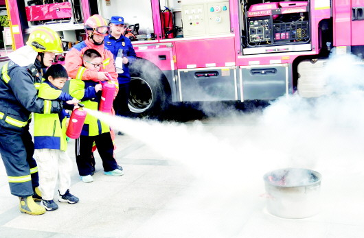 图为宣讲队员在六安市城北小学带领学生开展灭火模拟演练。